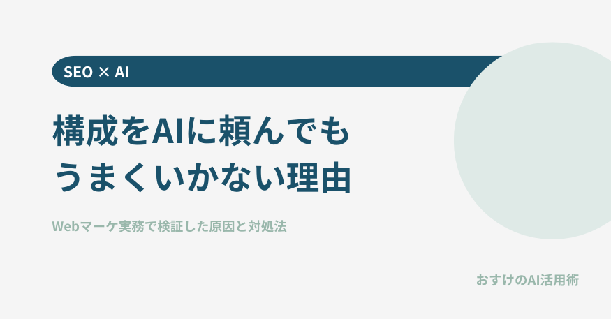 結論を先に書きます。AIに「使えない構成」を出させていた原因は、プロンプトに素材を渡していなかったからです。ターゲット・検索意図・差別化ポイント・自分の体験の4点をテキストで渡すと、誰向けかが明確な構成が出てきます。