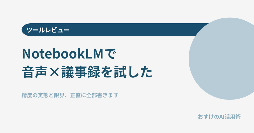 ただ、使ってみると「そのまま提出できる場面」と「手直しが必要な場面」がはっきりわかれました。この記事では、僕が実際にNotebookLMで議事録を作ってみた手順・使ったプロンプト・精度の実態・感じた限界をすべて公開します。